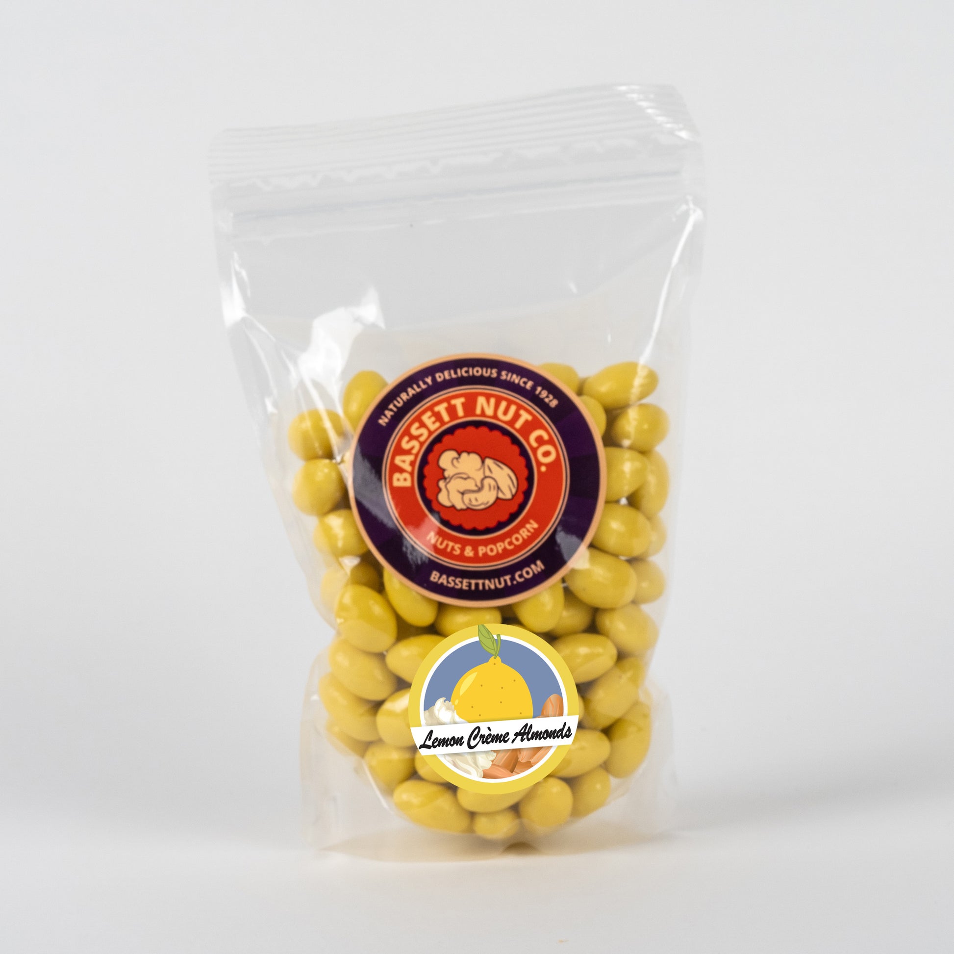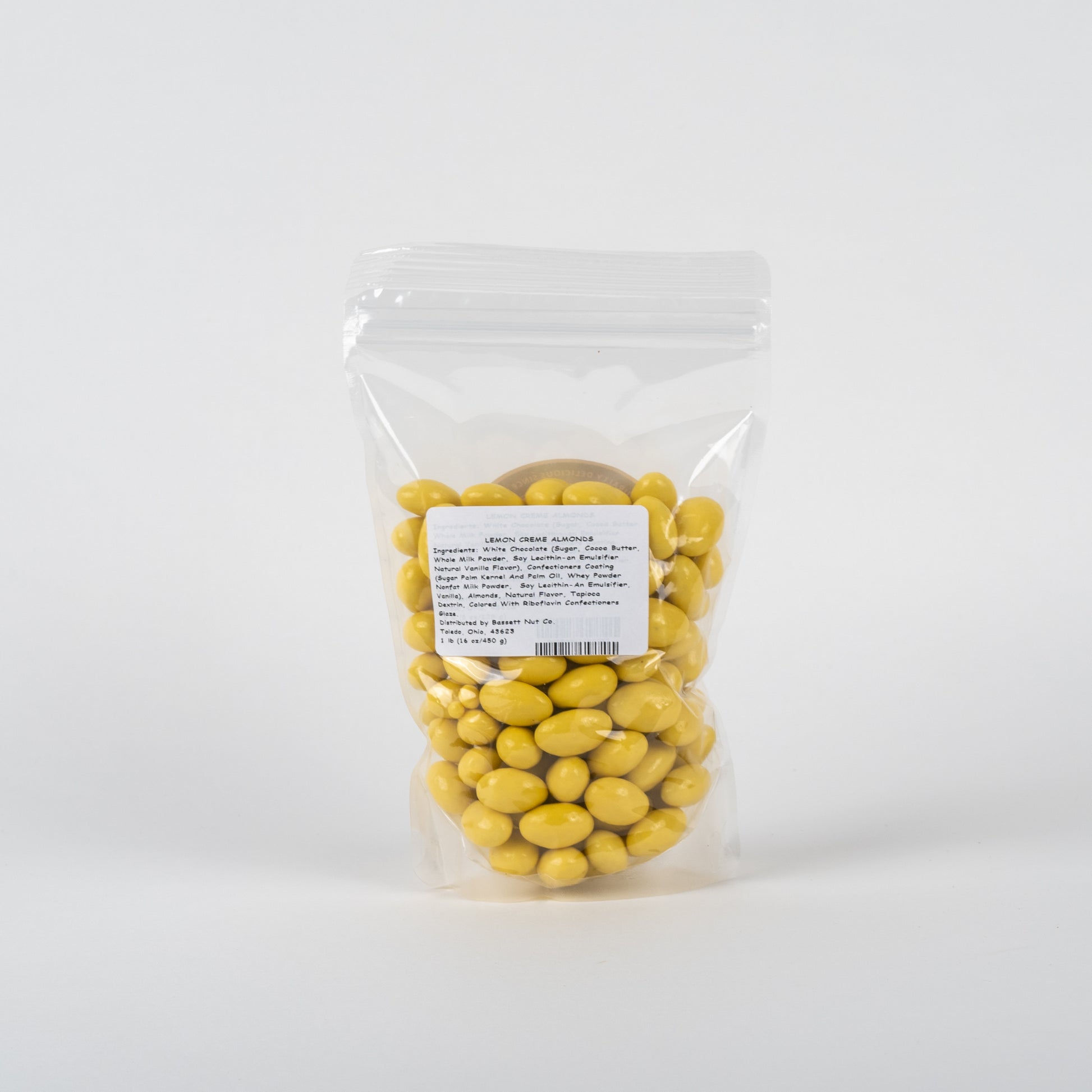 Our lemon crème almonds feature an extra creamy lemon confectioners coating with melt-in-your-mouth texture. Both sweet and tangy, the zing of lemony zest complements premium white chocolate for an irresistible flavor combination. Like sunshine in a snack, enjoy each delicious bite.